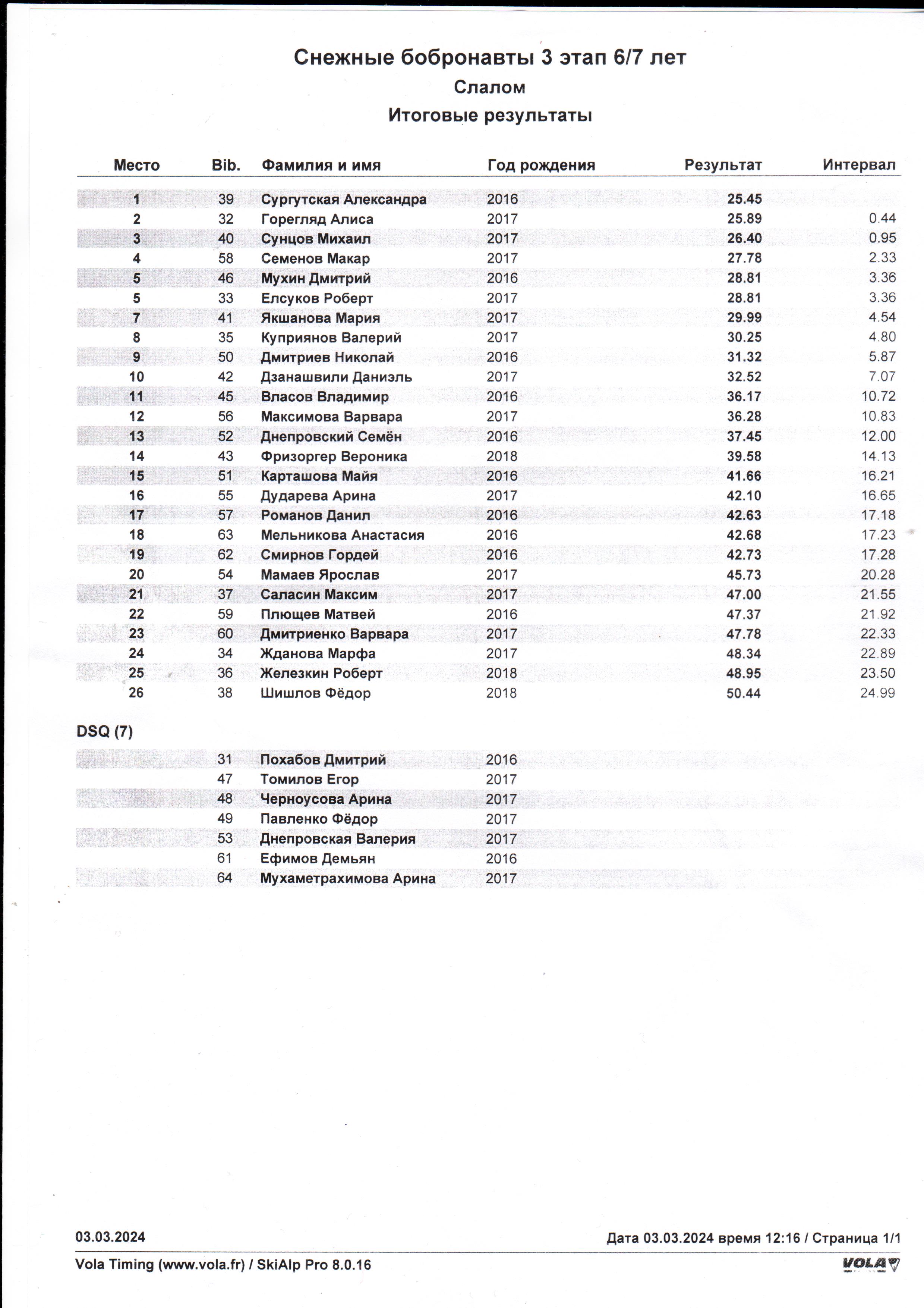 3 марта прошел третий этап детских соревнований «Снежные бобронавты», на старт вышло 51 мини-горнолыжник в возрасте от 4 до 7 лет. Лучшее время на трассе показал 7-ти летняя Александра Сургутская - 25.45 секунды.