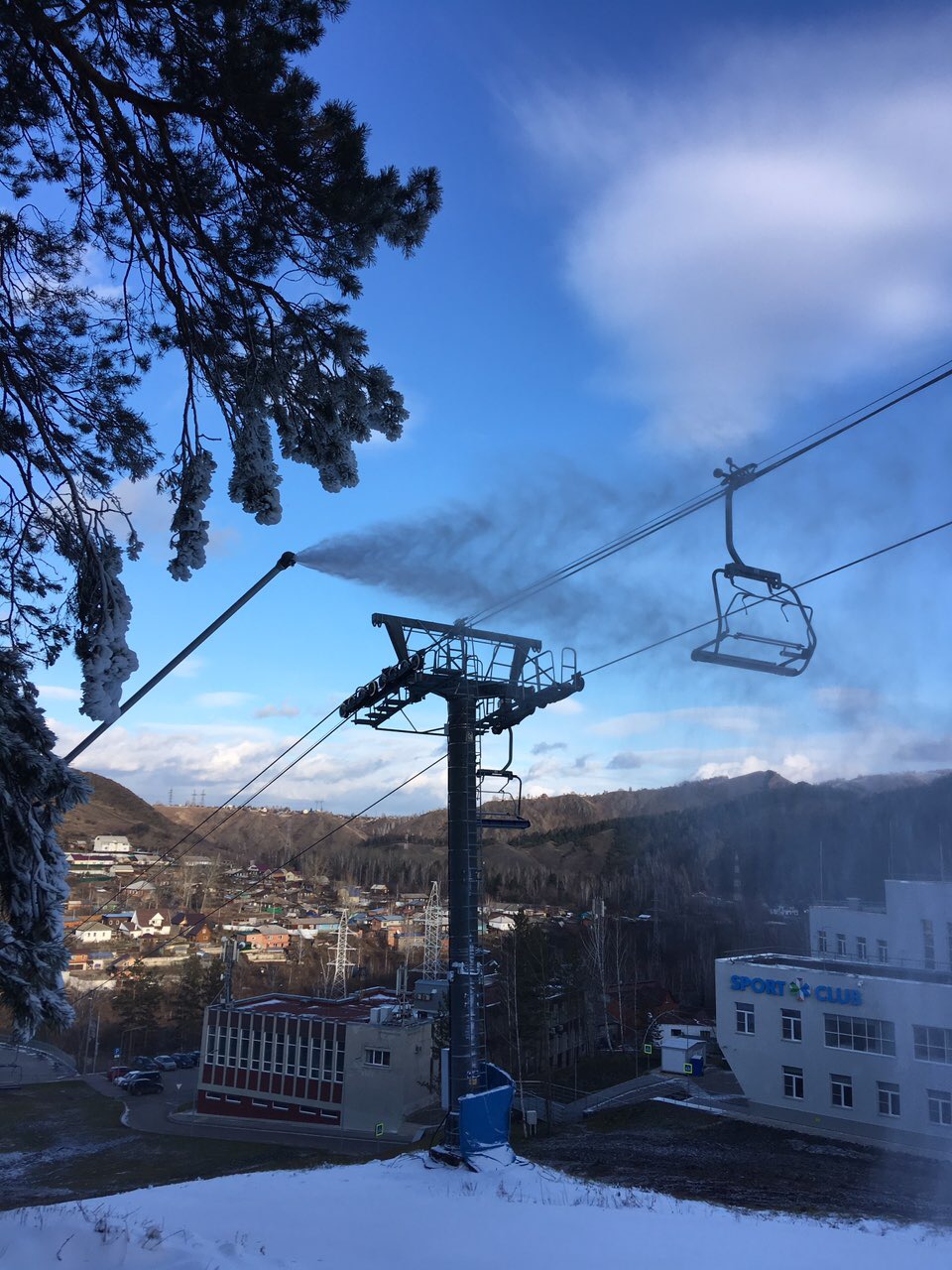 В Красноярске установилась минусовая температура, столбик термометра ночью опустился до отметки -8 градусов по Цельсию. В настоящий момент на трассах канатно-кресельного подъемника К2 искусственный снег генерируют 10 снежных пушек, на К1 – 23 снежных ружья.