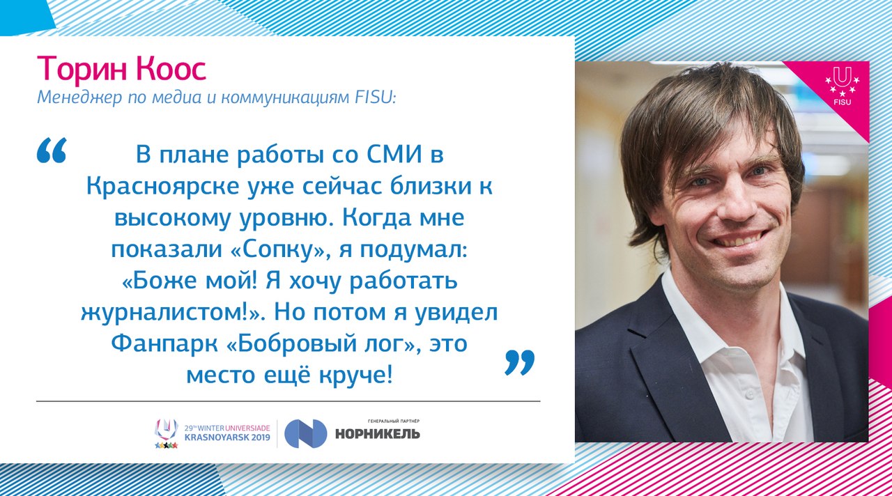 С 22 по 26 мая в Красноярске с рабочим визитом побывала делегация FISU во главе с первым вице-президентом Леонцем Эдером. В рамках визита специалисты побывали на объектах Зимней универсиады-2019, проверили, как проходит подготовка к проведению церемоний награждения, оценили организацию услуг для гостей и участников Зимней универсиады-2019.