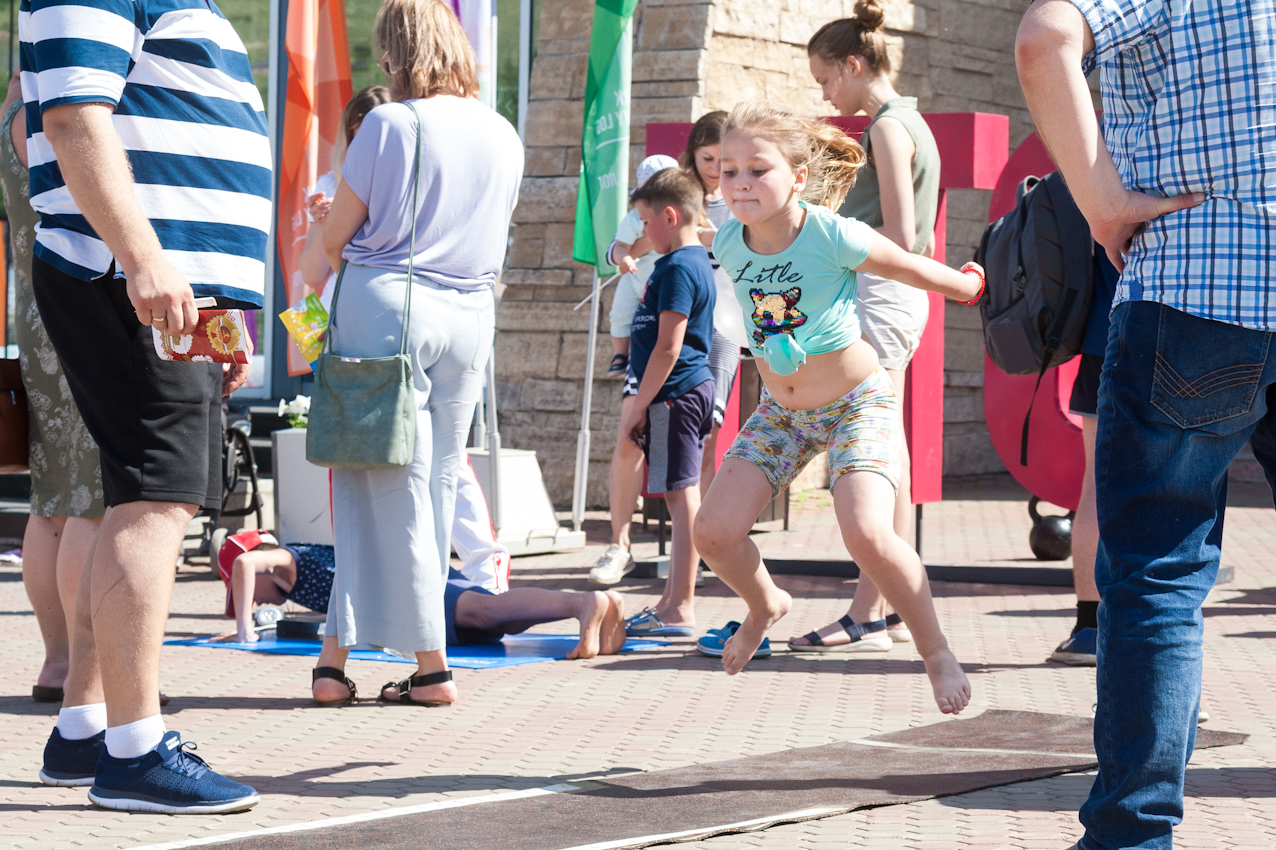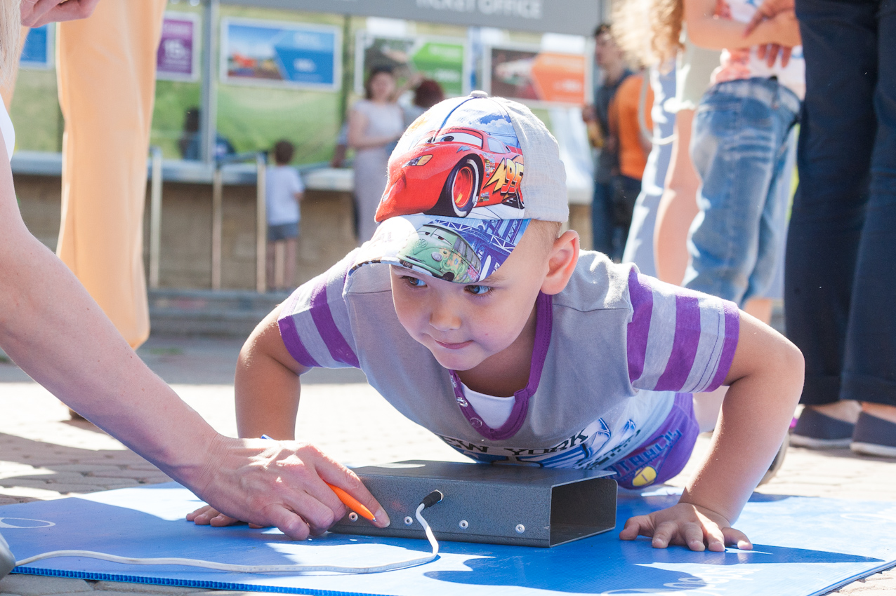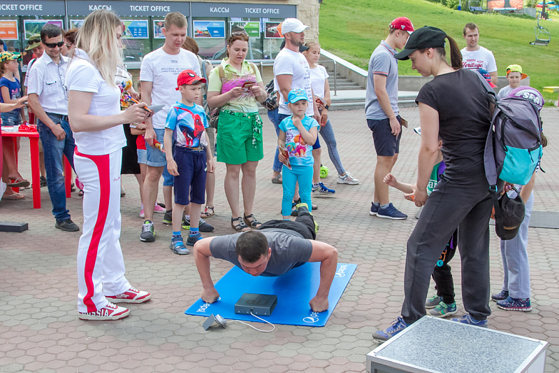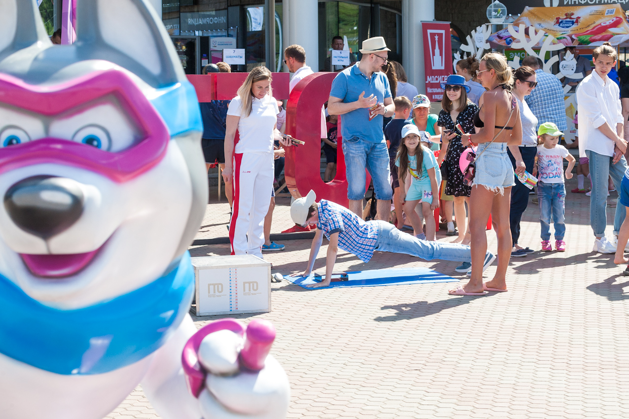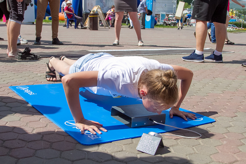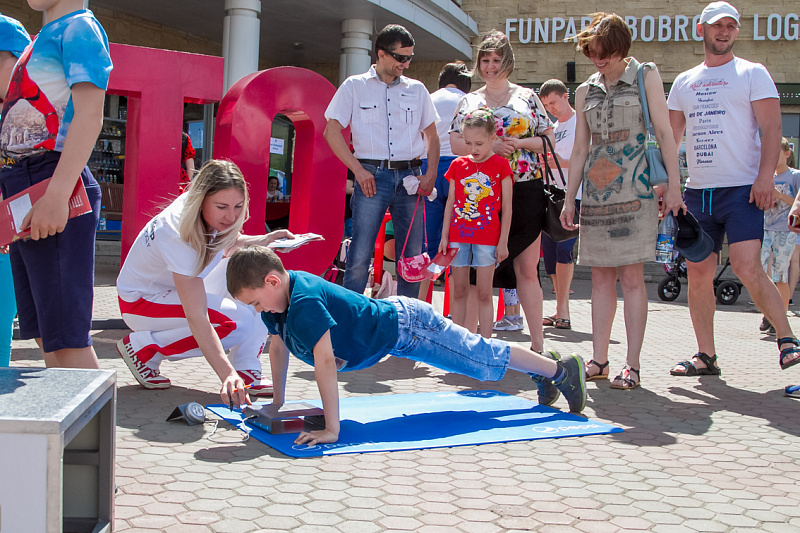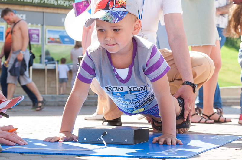 Одной из самых популярных локаций стала спортивная, где и малыши, и взрослые могли проверить свою выносливость и силу. Здесь можно было тягать гирю, отжиматься при помощи специального устройства, считающего повторения, прыгать в длину, поиграть в шахматы и так далее.