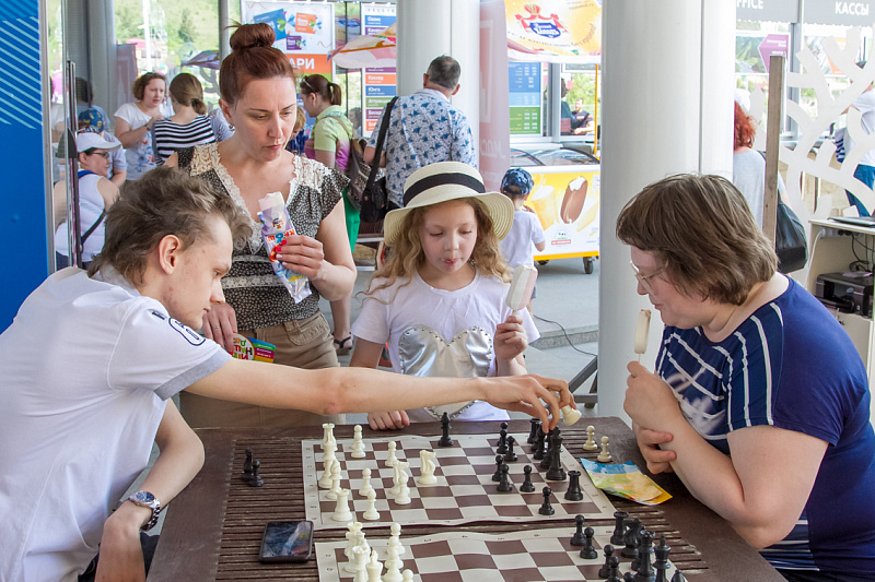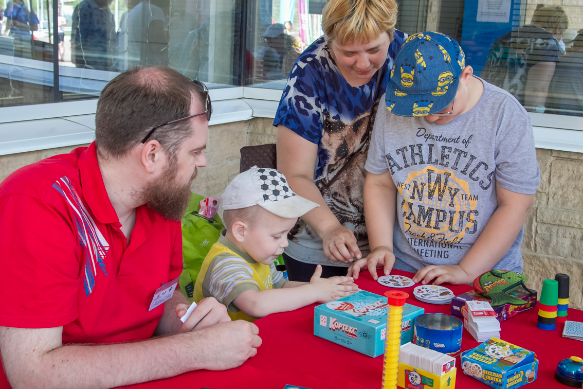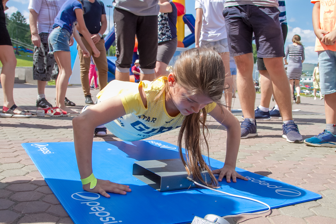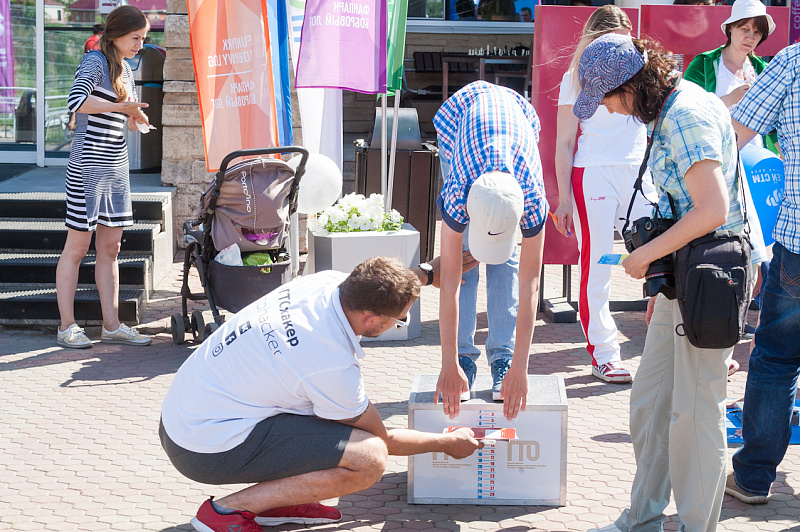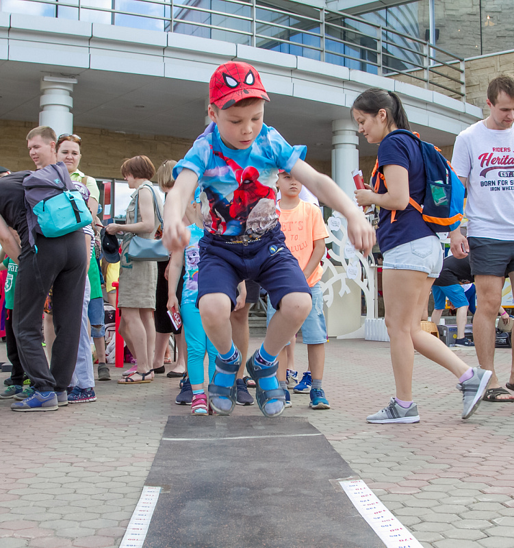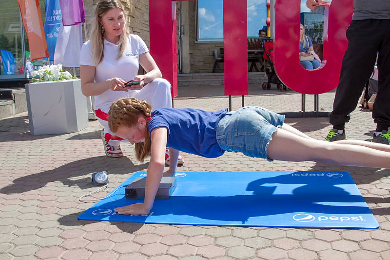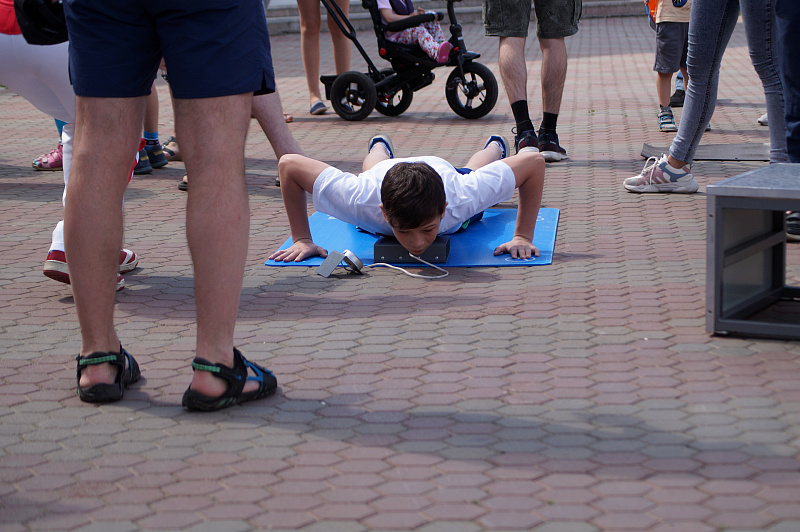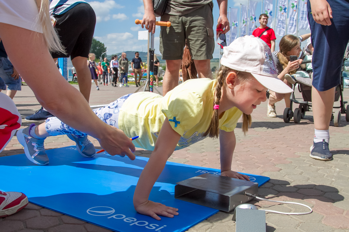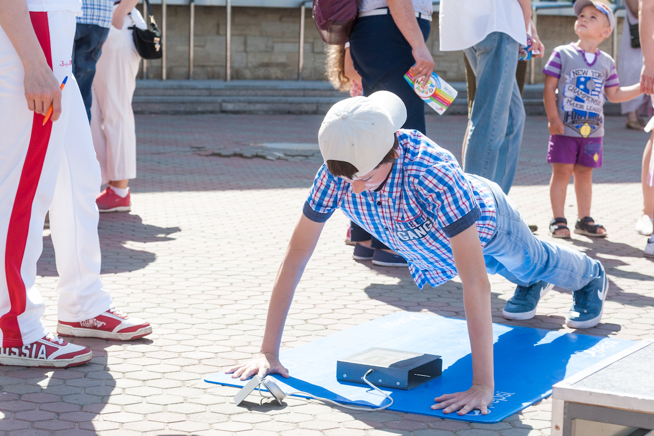 Одной из самых популярных локаций стала спортивная, где и малыши, и взрослые могли проверить свою выносливость и силу. Здесь можно было тягать гирю, отжиматься при помощи специального устройства, считающего повторения, прыгать в длину, поиграть в шахматы и так далее.