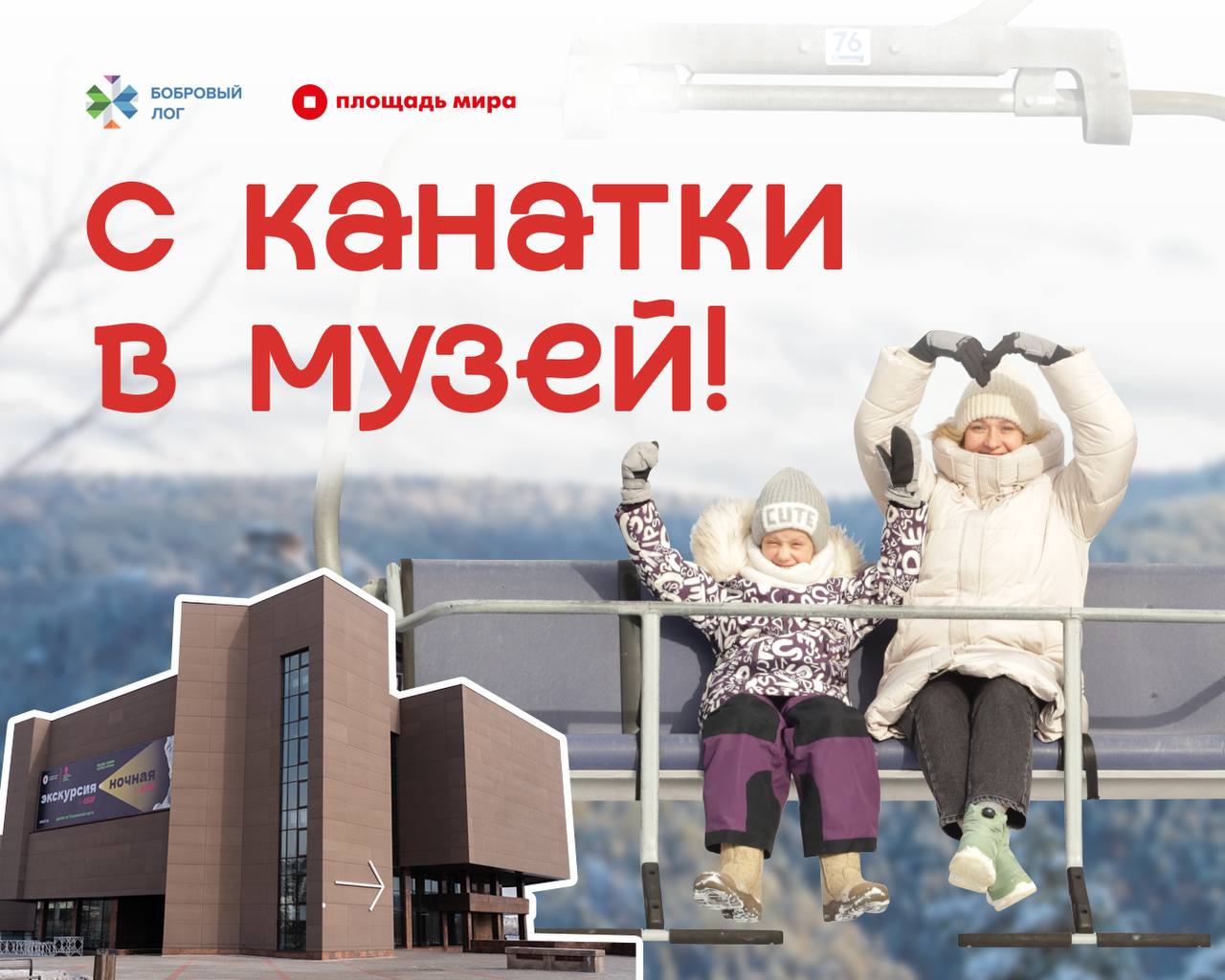 Прогулялся на канатке? Загляни в Музей! Фанпарк «Бобровый лог» и Музейный центр «Площадь Мира» делают твои выходные насыщенными! Поднимайся на канатной дороге, любуйся видами, а затем отправляйся в Музей — по прогулочному билету с подъёмника вход бесплатный! С 1 марта