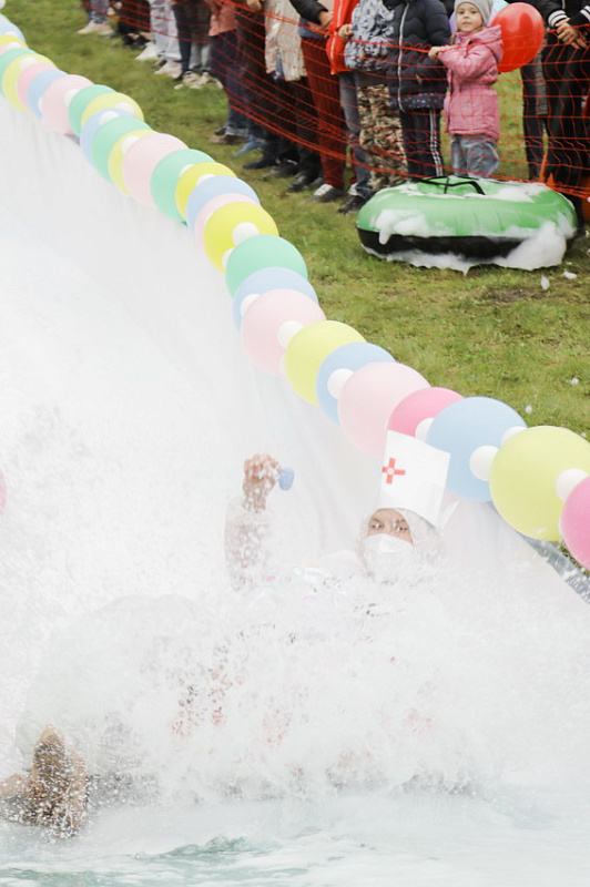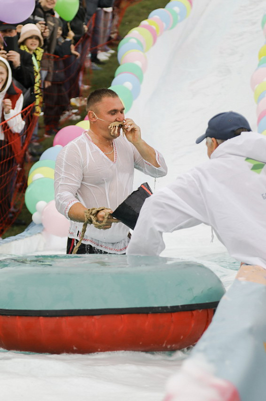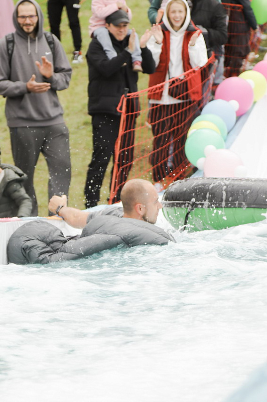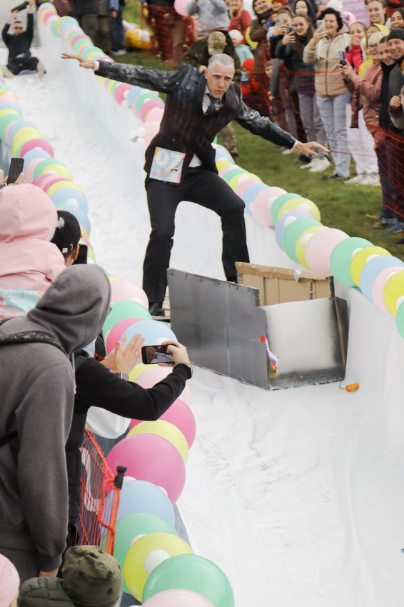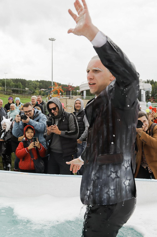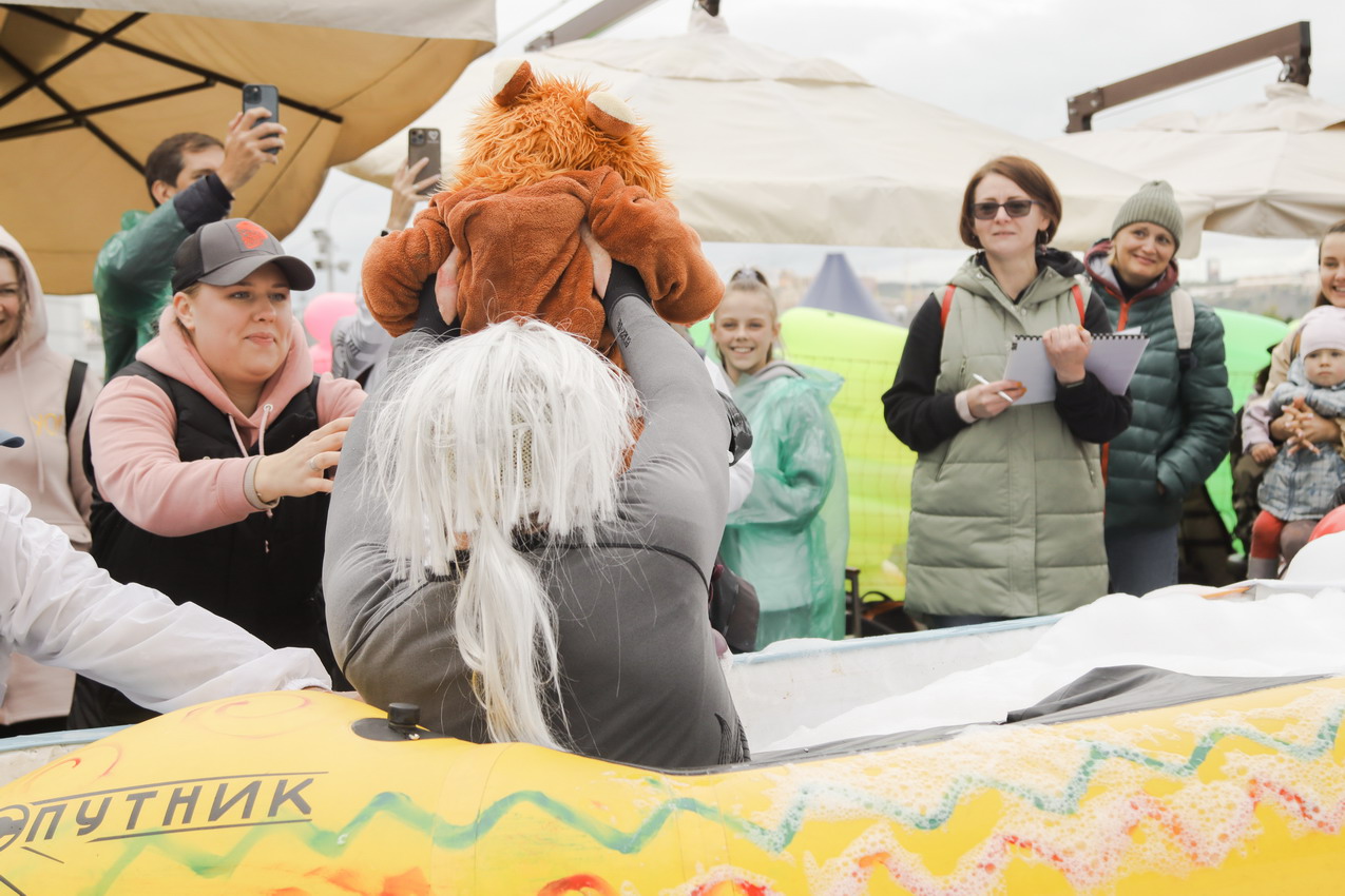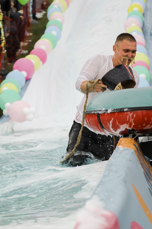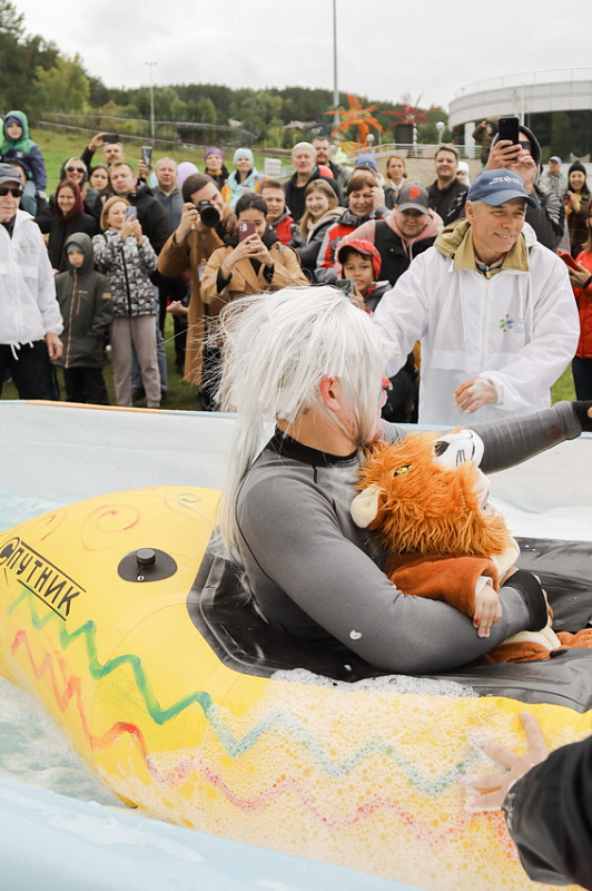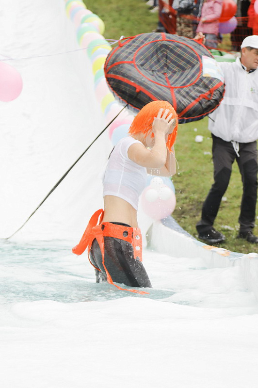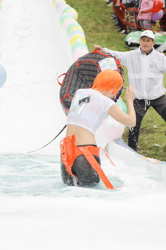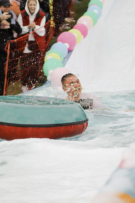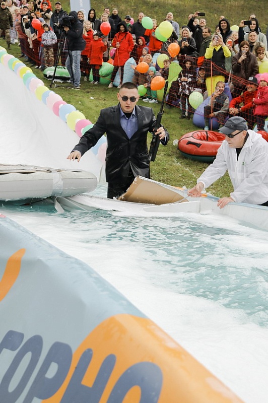 Первым по трассе в пенную лужу спустился Бобр! В роли Бобра выступила спасатель бассейна Людмила Анишина. По выходу из лужи сотрудницу «Бобрового лога» ждали аплодисменты зрителей и сюрприз - предложение руки и сердца!