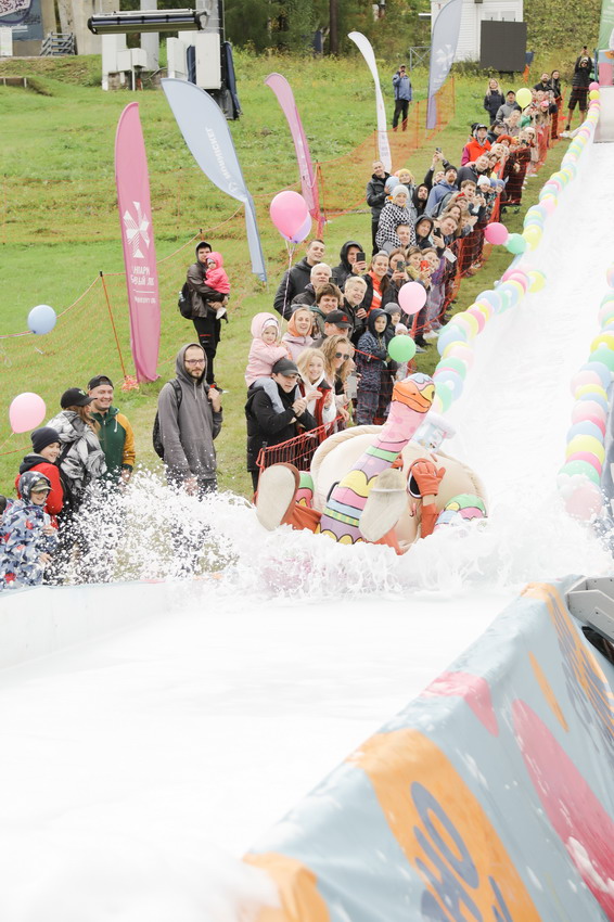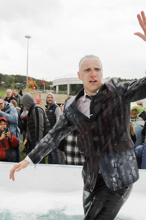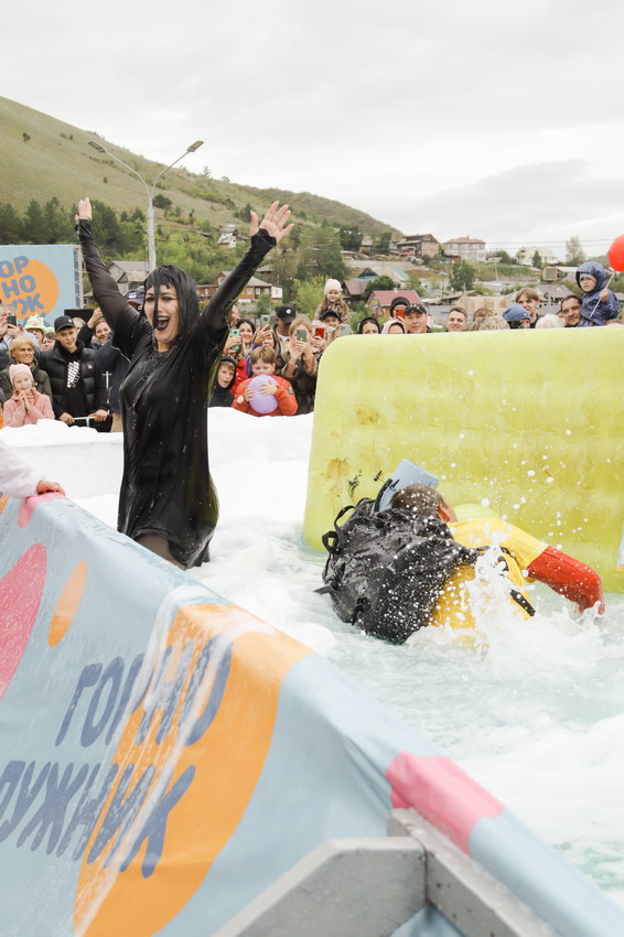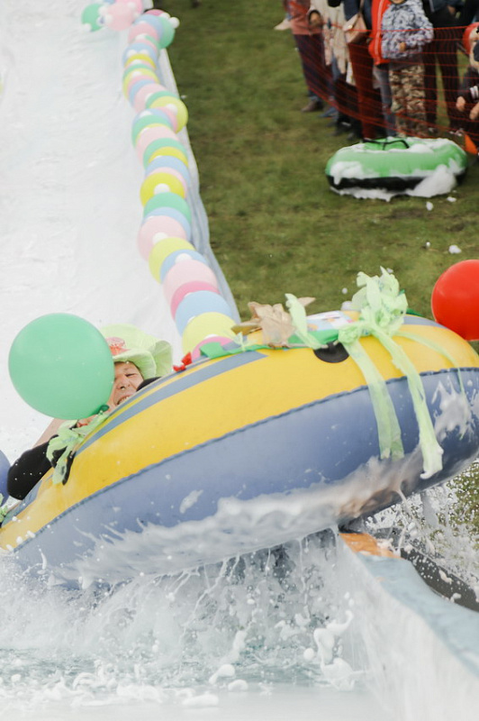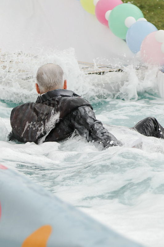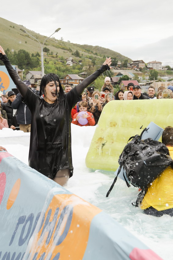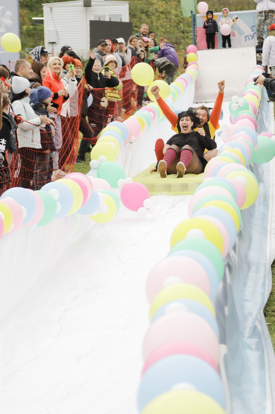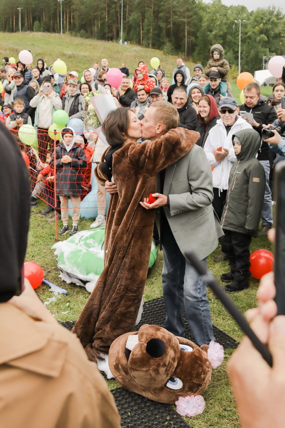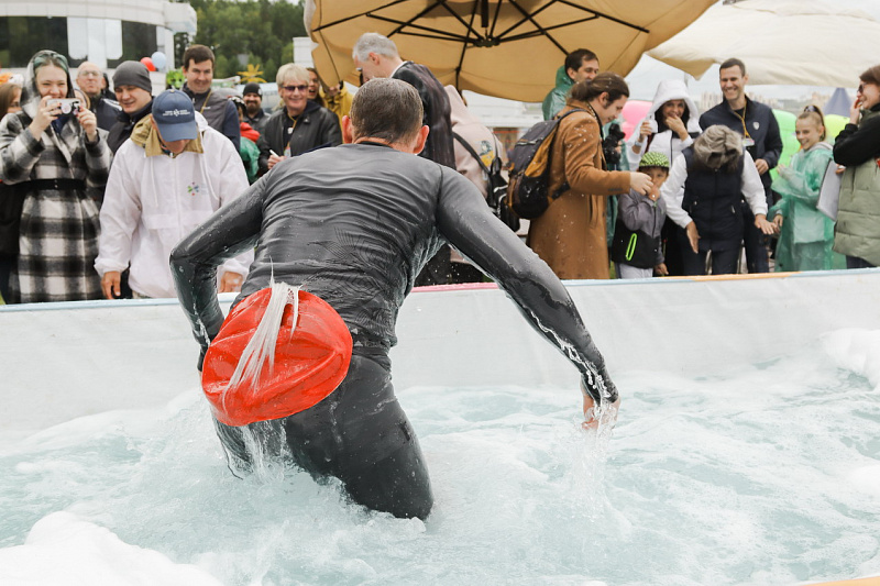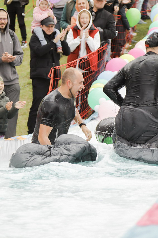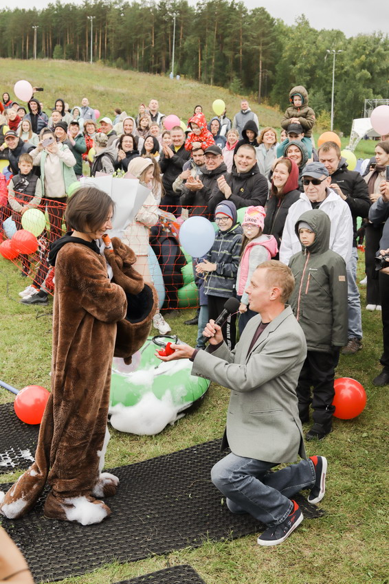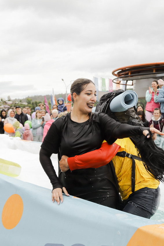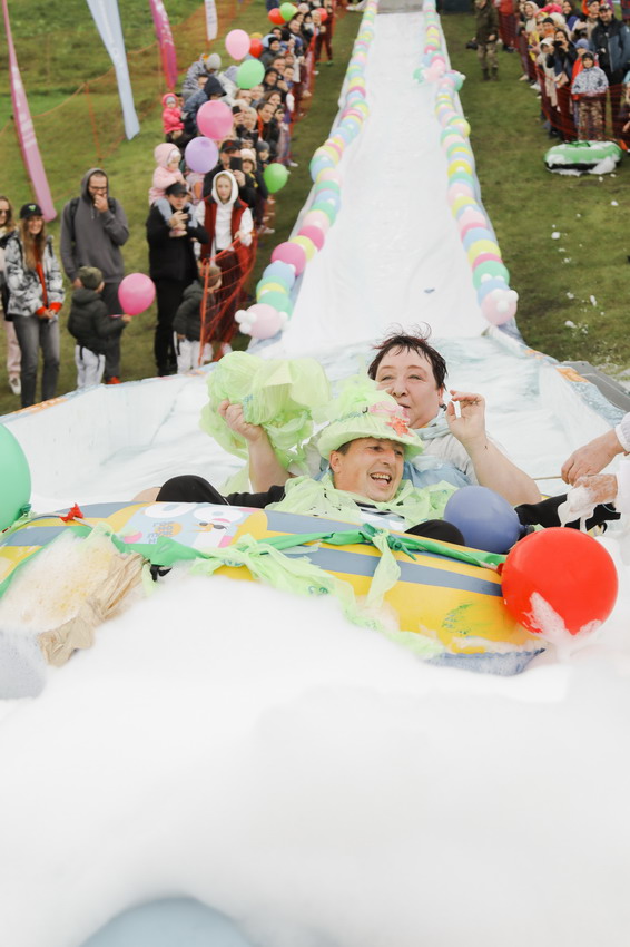 Первым по трассе в пенную лужу спустился Бобр! В роли Бобра выступила спасатель бассейна Людмила Анишина. По выходу из лужи сотрудницу «Бобрового лога» ждали аплодисменты зрителей и сюрприз - предложение руки и сердца!