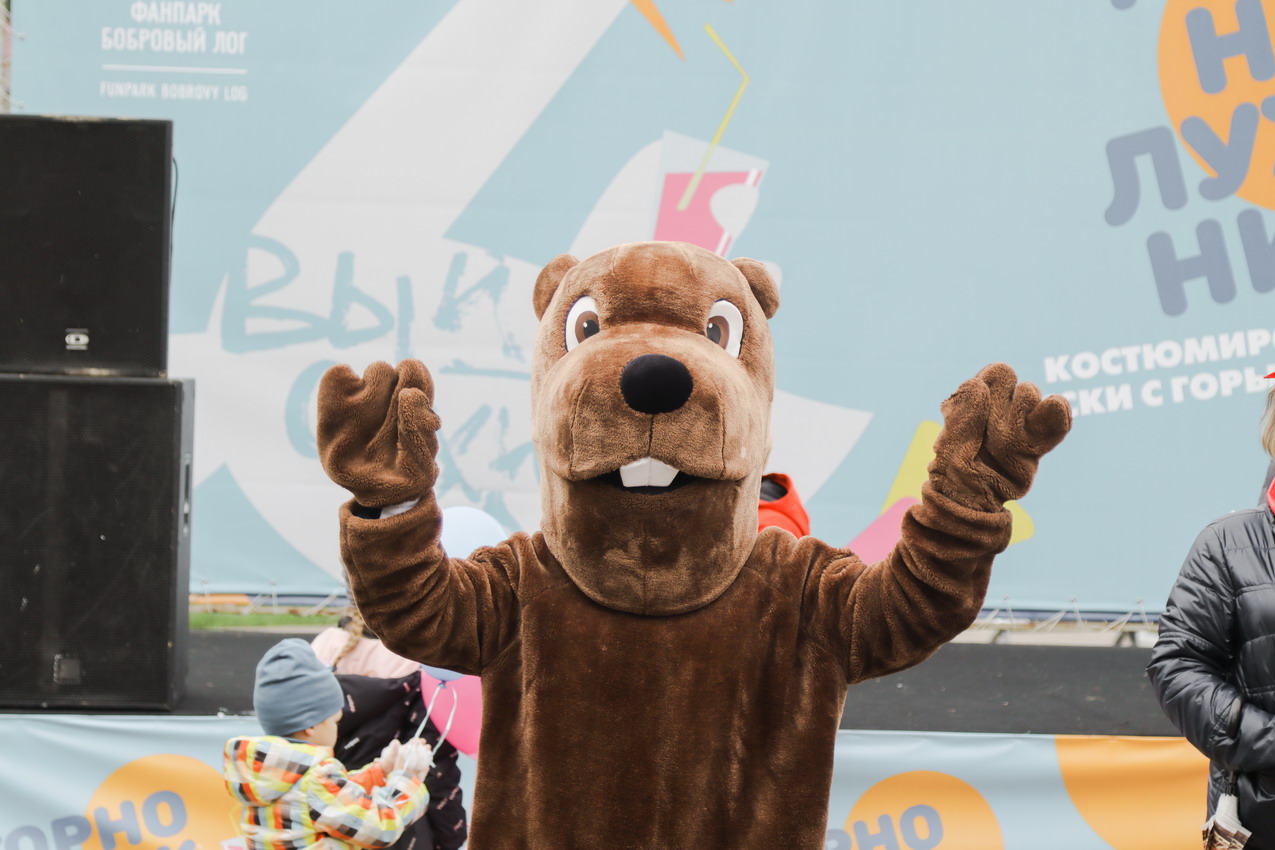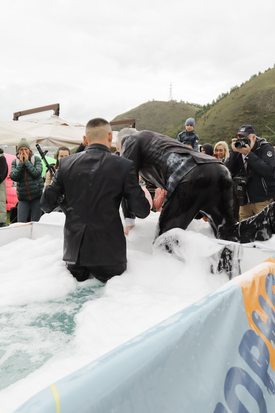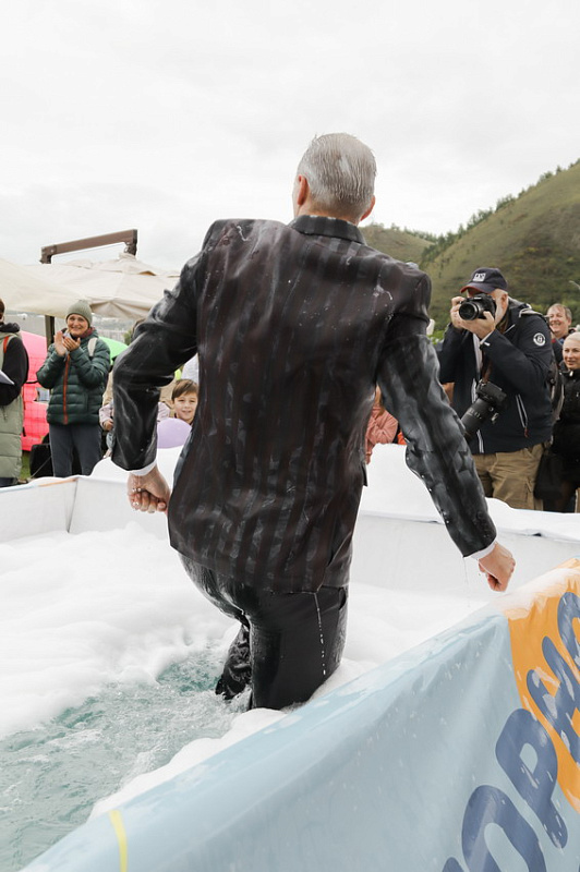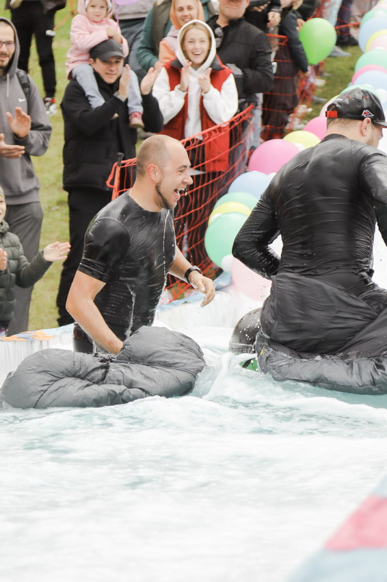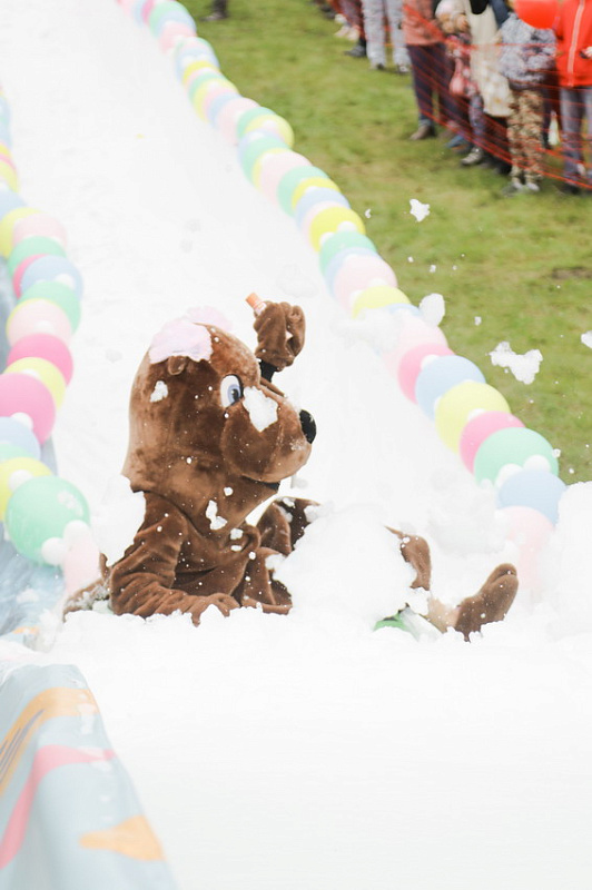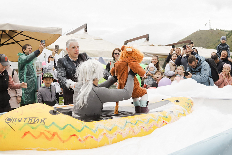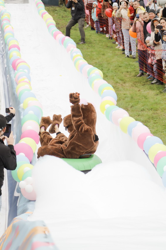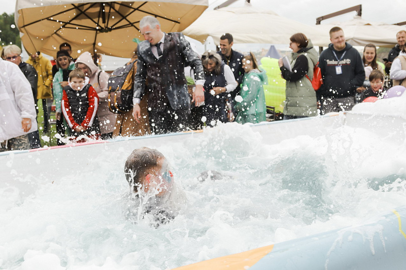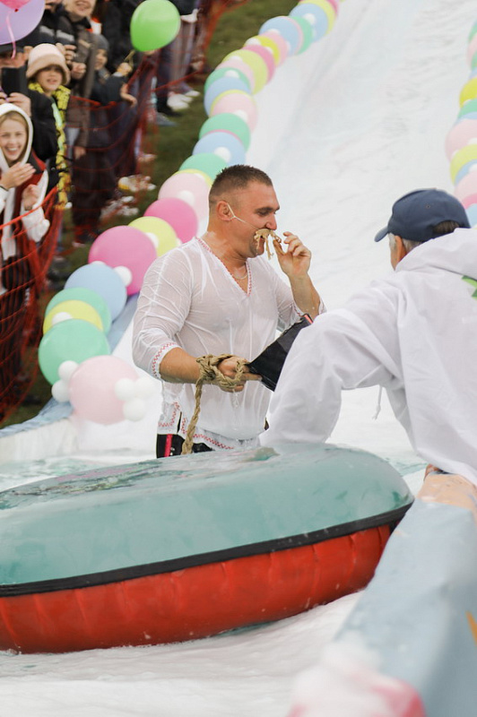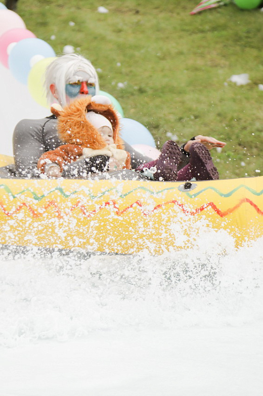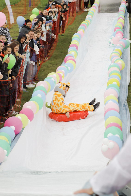 Первым по трассе в пенную лужу спустился Бобр! В роли Бобра выступила спасатель бассейна Людмила Анишина. По выходу из лужи сотрудницу «Бобрового лога» ждали аплодисменты зрителей и сюрприз - предложение руки и сердца!