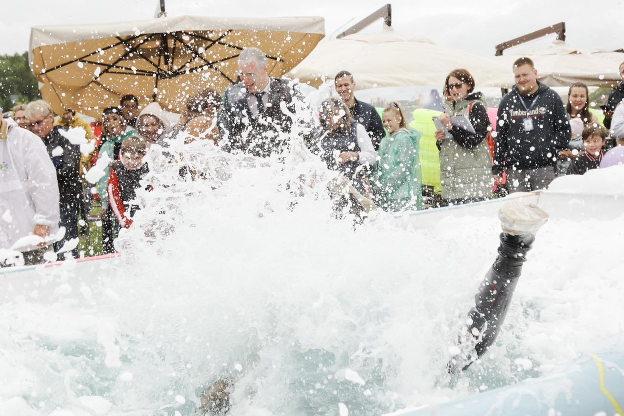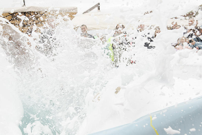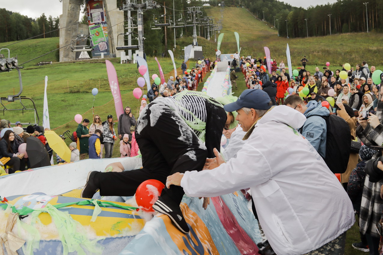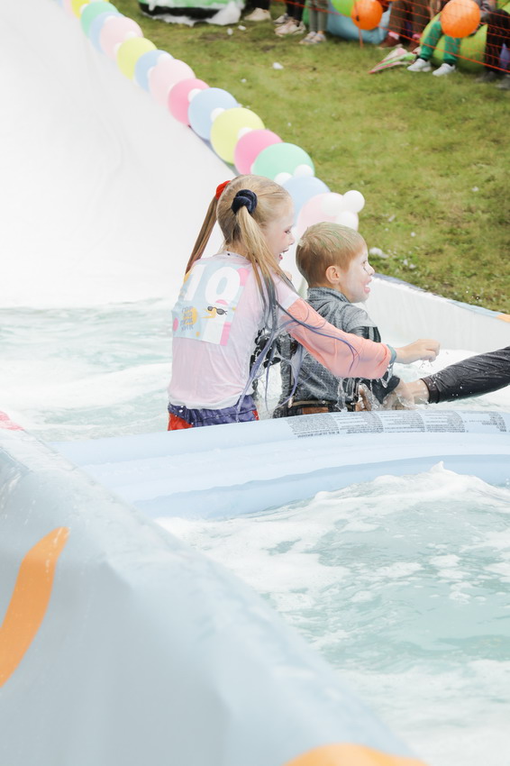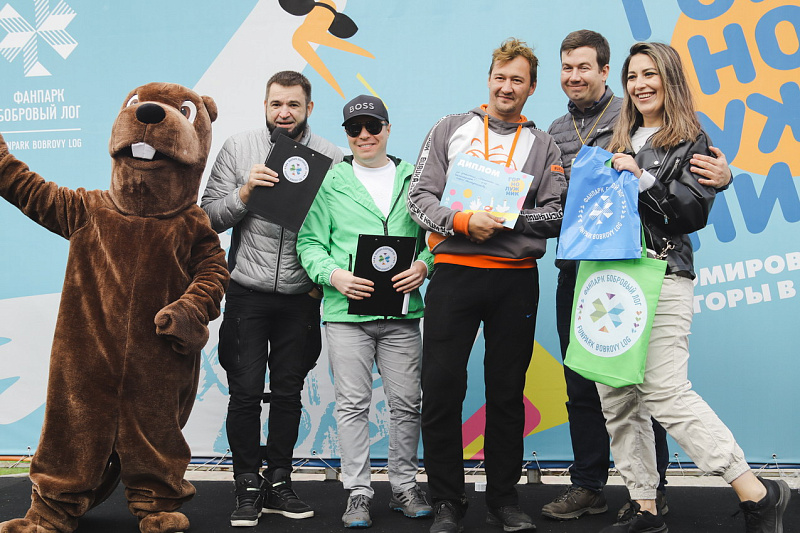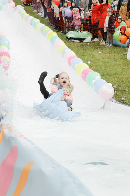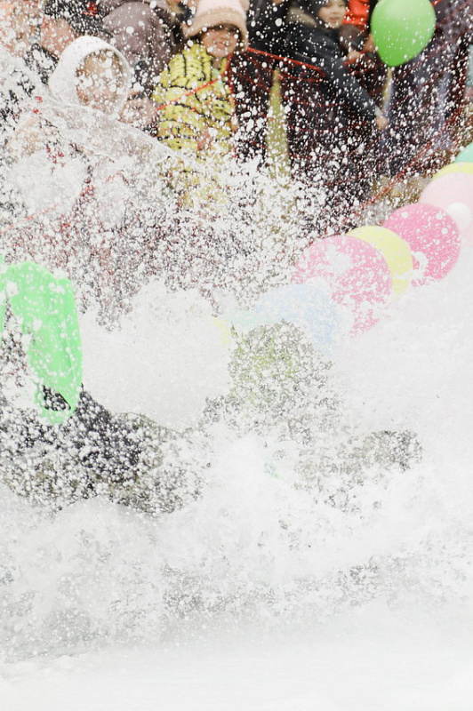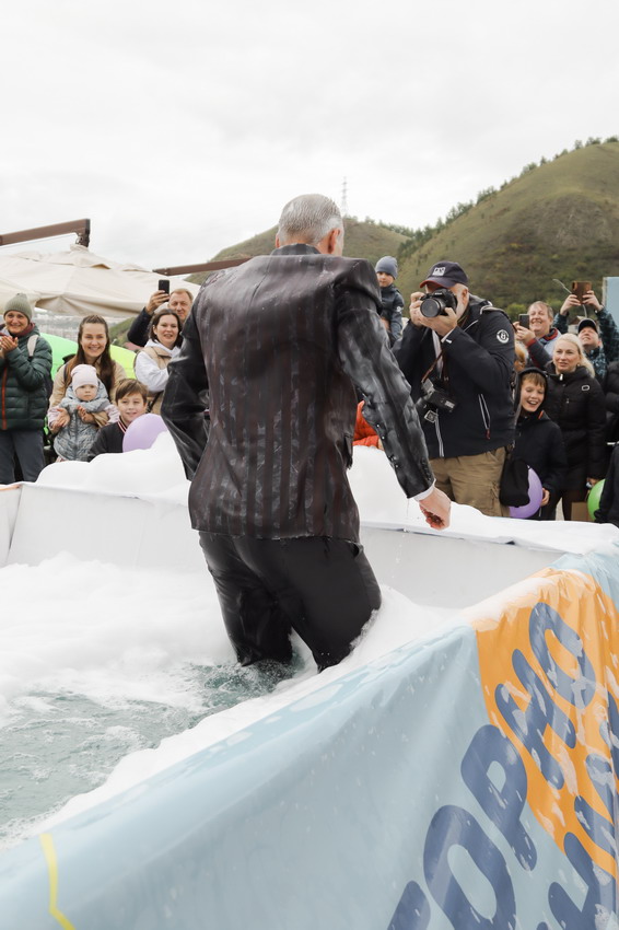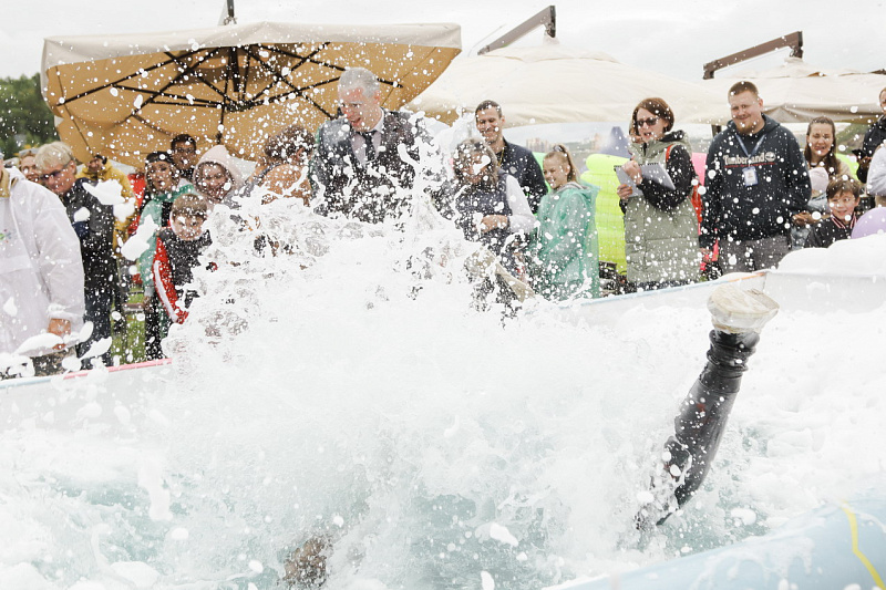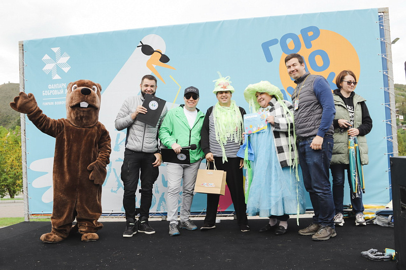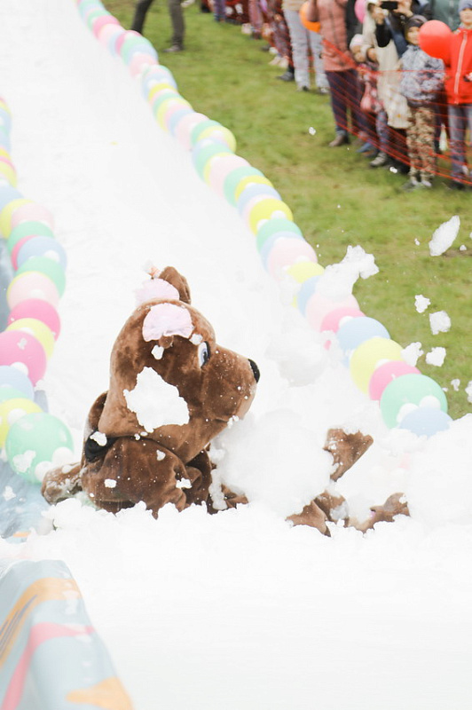 Первым по трассе в пенную лужу спустился Бобр! В роли Бобра выступила спасатель бассейна Людмила Анишина. По выходу из лужи сотрудницу «Бобрового лога» ждали аплодисменты зрителей и сюрприз - предложение руки и сердца!