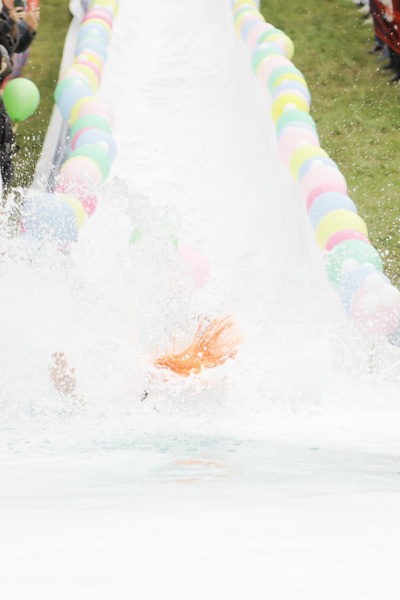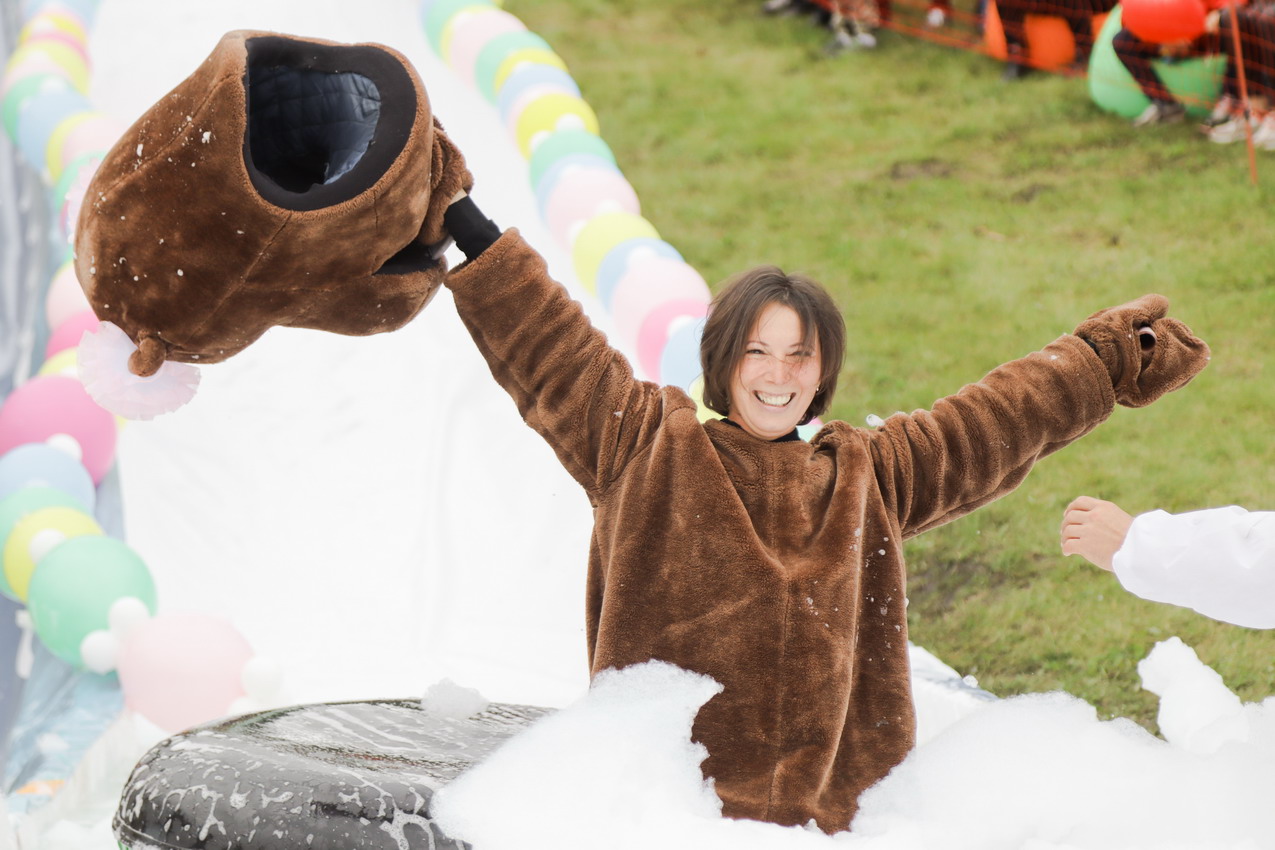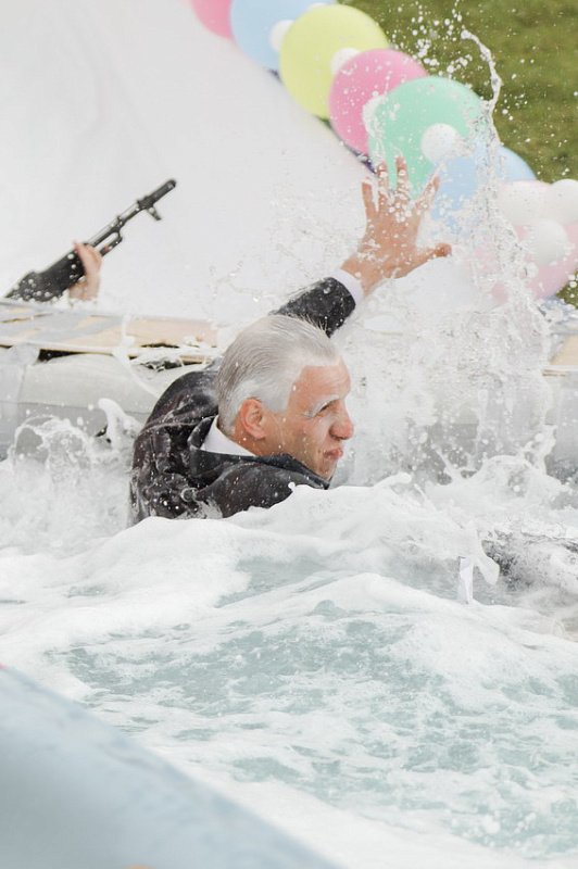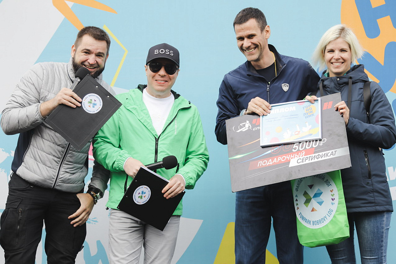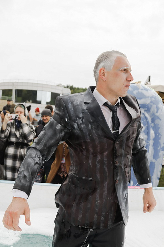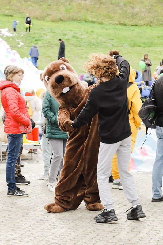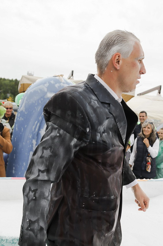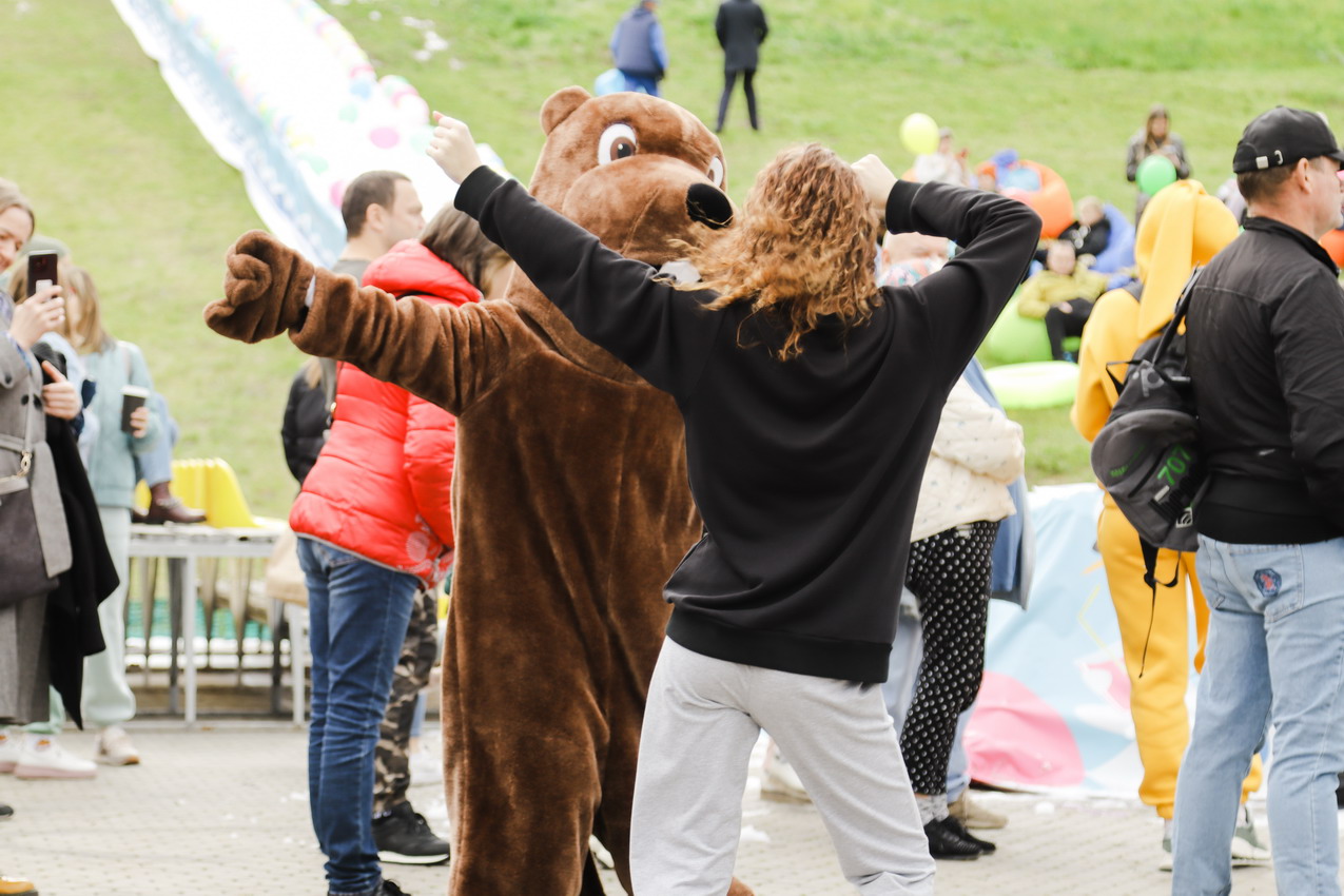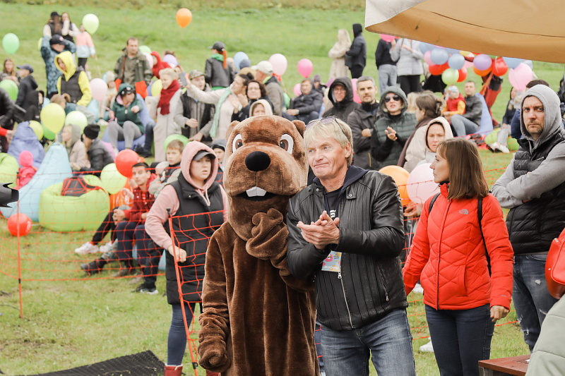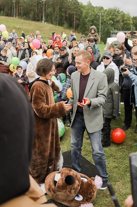 Первым по трассе в пенную лужу спустился Бобр! В роли Бобра выступила спасатель бассейна Людмила Анишина. По выходу из лужи сотрудницу «Бобрового лога» ждали аплодисменты зрителей и сюрприз - предложение руки и сердца!