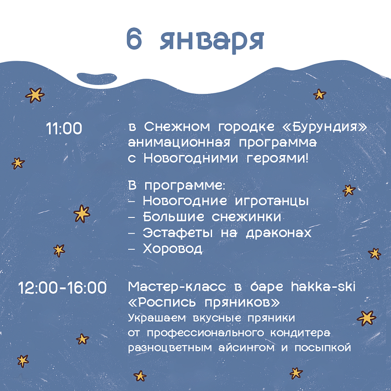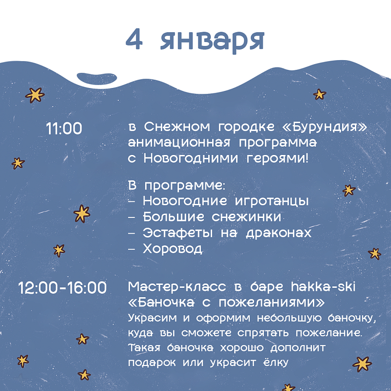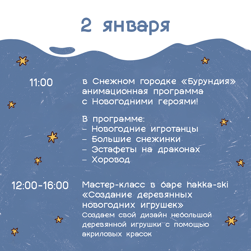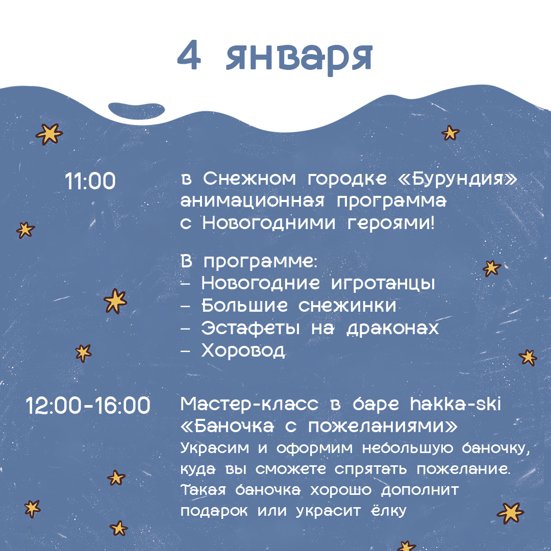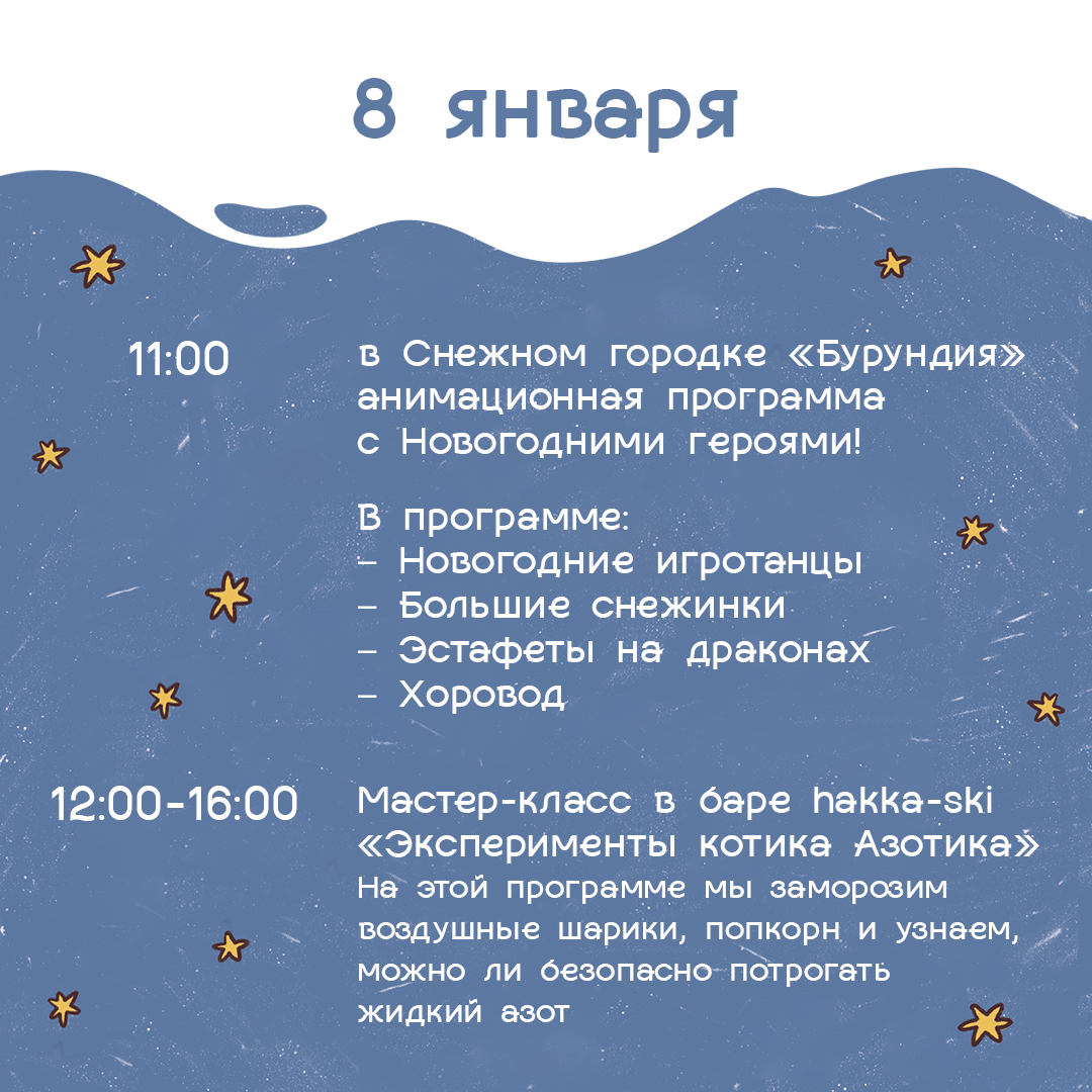 В новогодние каникулы со 2 по 8 января для ребятишек в снежном городке «Бурундия» (он находится в комплексе «Мираж» там, где раньше был каток) ежедневно будет проходить развлекательная программа с новогодними героями и мастер-классами на любой вкус. Билеты в снежный городок можно будет приобрести в кафе-баре HaKKa-Ski, и в течение посещения использовать сумму стоимости билета, как депозит на меню бара.