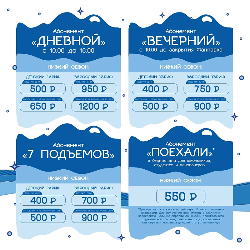 Мы проанализировали статистику прошлых сезонов и ввели 2 новых тарифа для самых крупных аудиторий — любителей дневного и любителей вечернего катания.