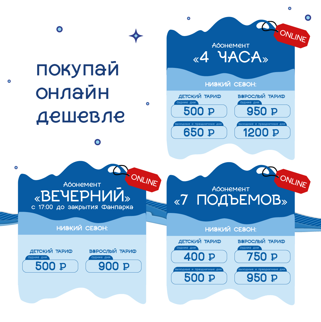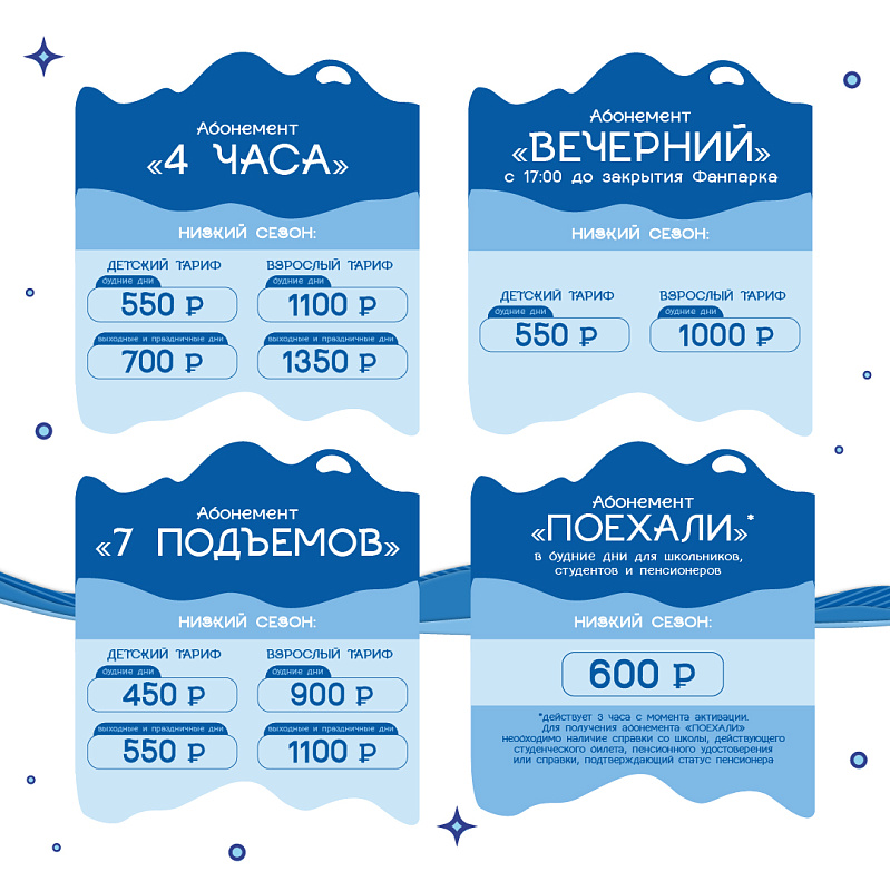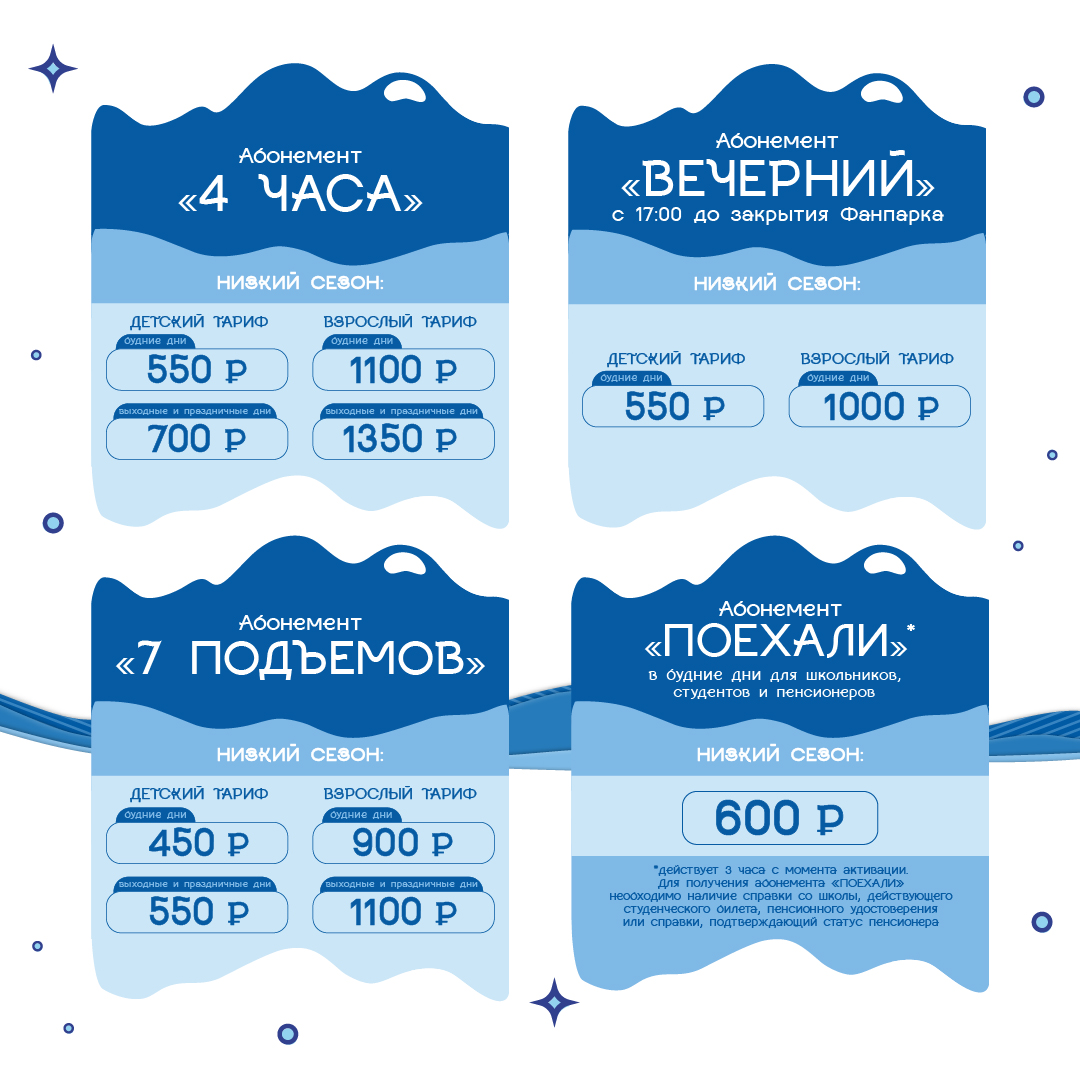 У абонементов нет ограничений в количестве подъемов, но предусмотрена 5-минутная отсечка между проходами через турникет. Стоимость «4-х часового» абонемента в «низкий сезон» в кассе для взрослых будет 1100 рублей в будни и 1350 рублей в выходные, «вечернего» абонемента — 1000 рублей и в будни, и в выходные.
