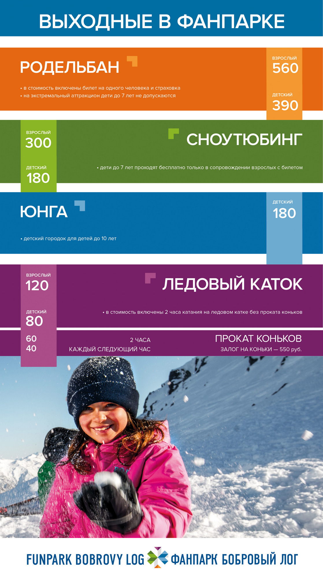Напоминаем, что так же работает ледовый каток. Стоимость билета на 2 часа для детей составит 80 рублей, для взрослых – 120 рублей. Прокат коньков на 2 часа – 60 рублей (залоговая стоимость – 550 рублей).