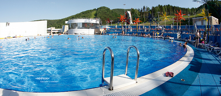Пляжный комплекс «Мираж» предусмотрен для отдыха детей и взрослых. Местоположение комплекса в рекреационной зоне в непосредственной близости с заповедником «Столбы», чистый воздух, удаленность от загазованной части города делает его уникальным. Современная система водоподготовки позволяет поддерживать температуру воды на уровне +25..+27°С круглосуточно. Бассейн оборудован водными аттракционами (горки для детей, водные батуты) и ярусами с шезлонгами. Диаметр бассейна 36 метров, глубина – 1,5 метра.