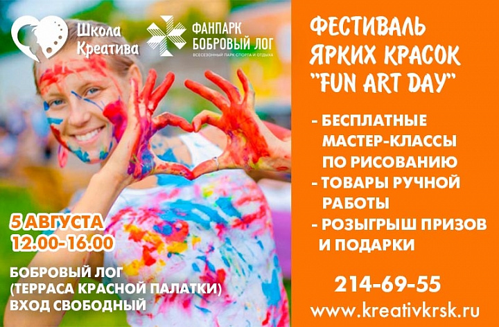 Впереди прекрасный теплый уикенд и мы приготовили для всех желающих провести выходной в дружеской атмосфере творчества и позитива отличное мероприятие на свежем вкусном воздухе - ФанАртДэй! В этот день можно будет совместить приятное с полезным: кроме кислородо-терапии для всей семьи можно будет купить подарки и сувениры ручной работы и, конечно, порисовать! Только подумайте - 10 разных площадок и все про рисование: правополушарное рисование; роспись одежды; рисование на воде (эбру); рисование гуашью и акварелью; рисование растворимым кофе; рисование открыток и комиксов; роспись камней! Ну и конечно какой праздник без аквагрима (от 150 рублей) и  мехенди (от 50 рублей). Вход на мероприятие: СВОБОДНЫЙ. А еще будет студия танцев Chocolate, которая проведет мастер-классы по йоге, парным и детским танцам; клуб настольных игр "После Дождя" организует игротеки для ребят и взрослых. Благотворительный фонд "Твори добро своими руками " проведет благотворительную акцию “твори добро”, а также будет бесплатно детям раздавать шары, продавать продукцию со своим логотипом, рассказывать о себе и своей деятельности. Агентство праздников “Star Rainbow Holidays” готовит для всех сюрприз! Все площадки работают параллельно с 12:00 до 16.00; в 15.30 розыгрыш подарков от партнеров. Ждем Вас на нашем мероприятии. Приходите, будет интересно!